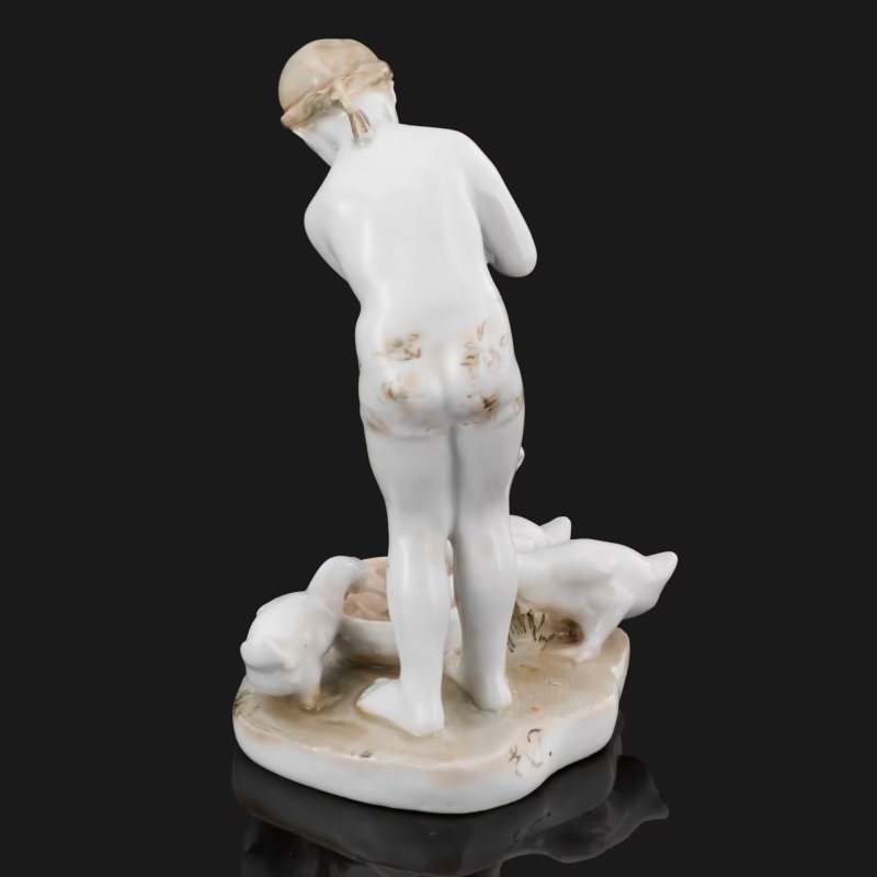 Статуэтка известна под названием “Девочка с гусятами”, исполнена в 1950-1960-х гг., то есть как раз в период, когда Гатилова работала на Дулевском фарфоровом заводе. Эта работа явно принадлежит серии, посвященной сельским мотивам. Объединение в одну композицию образа человека и животного – излюбленный прием художницы, который встречается, как упоминали выше, не раз. Центром группы становится миска, к которой девочка склоняется, насыпая туда из ладошек корм. Окружают ее три гусенка, двое клюют из миски, а третий изогнул шею и глядит на маленькую труженицу.