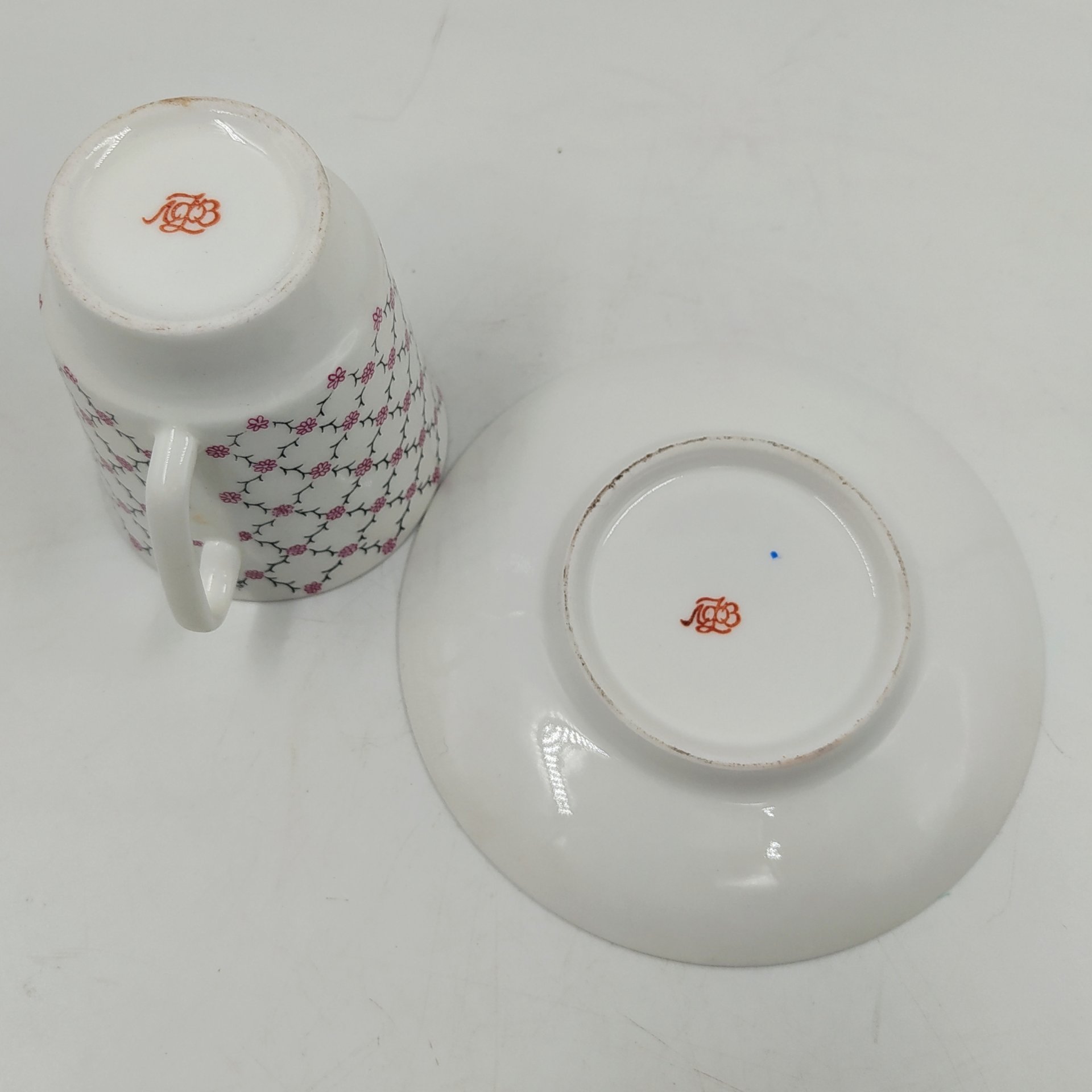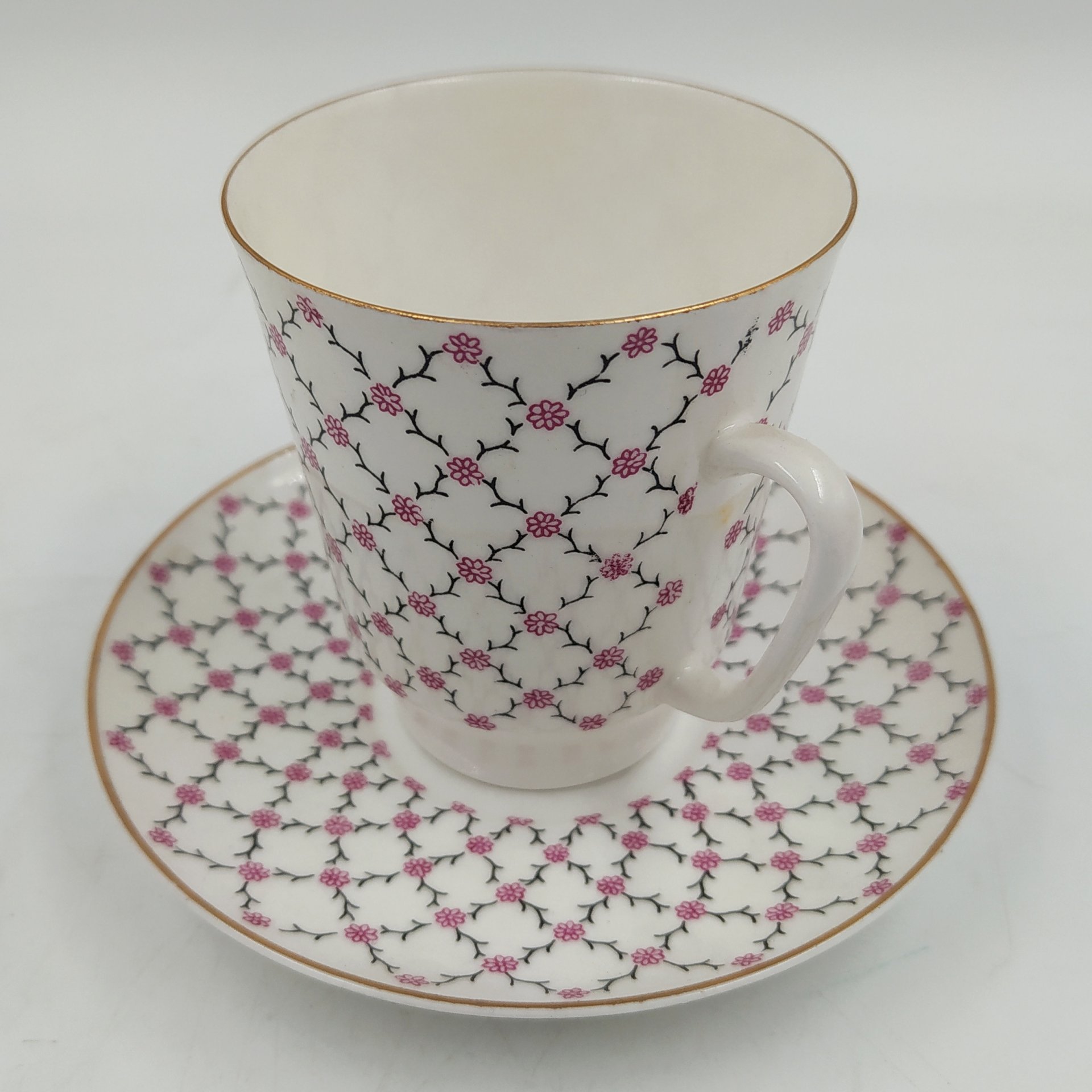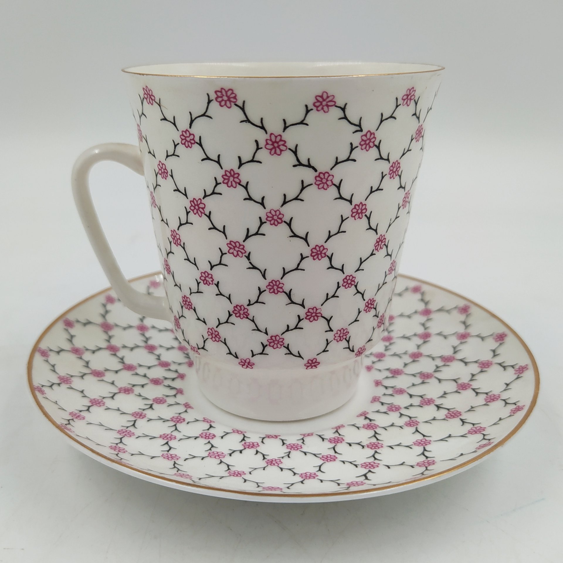 Кофейная пара "Розовая сетка", форма "Майская", автор формы Э.М. Криммер, автор рисунка Л.С. Лобанкова, фарфор, деколь, золочение, Ленинградский фарфоровый завод (ЛФЗ), Россия, 1992-2001 гг. (арт. 56860)