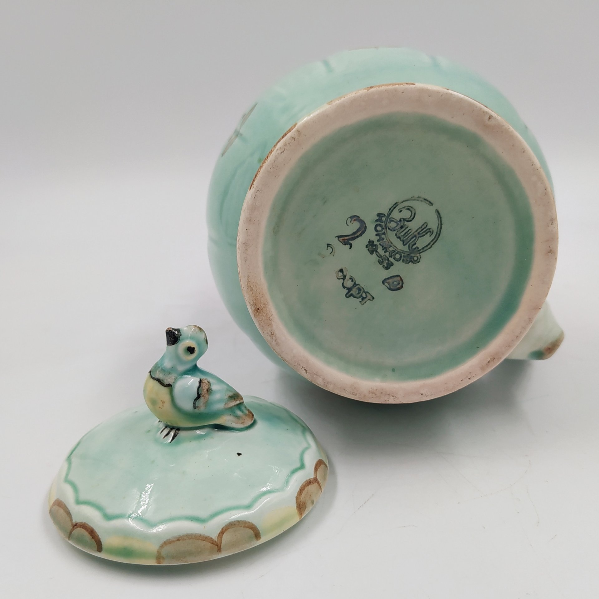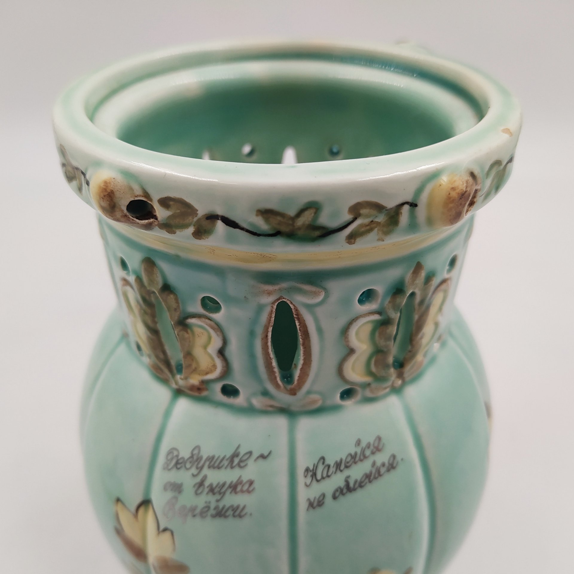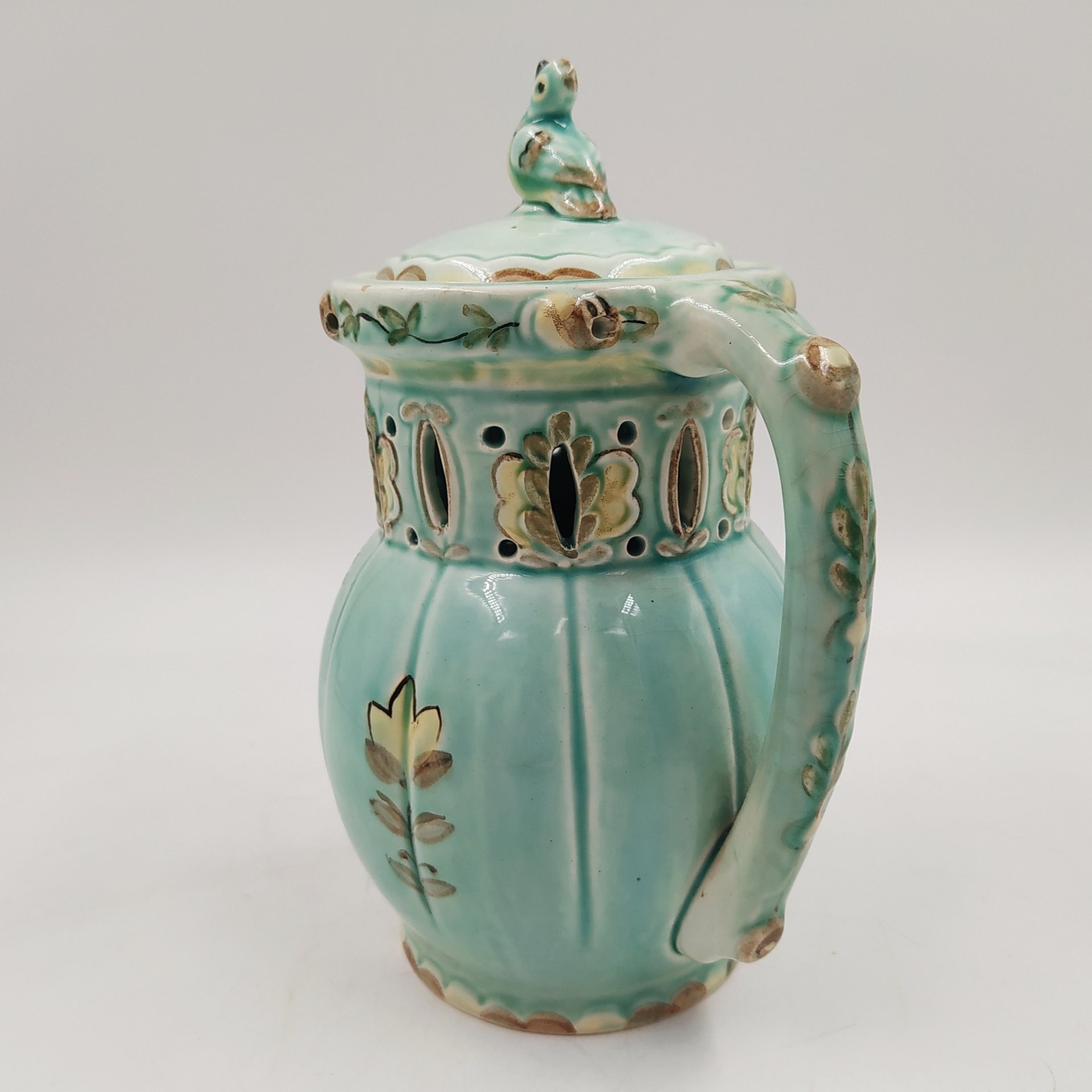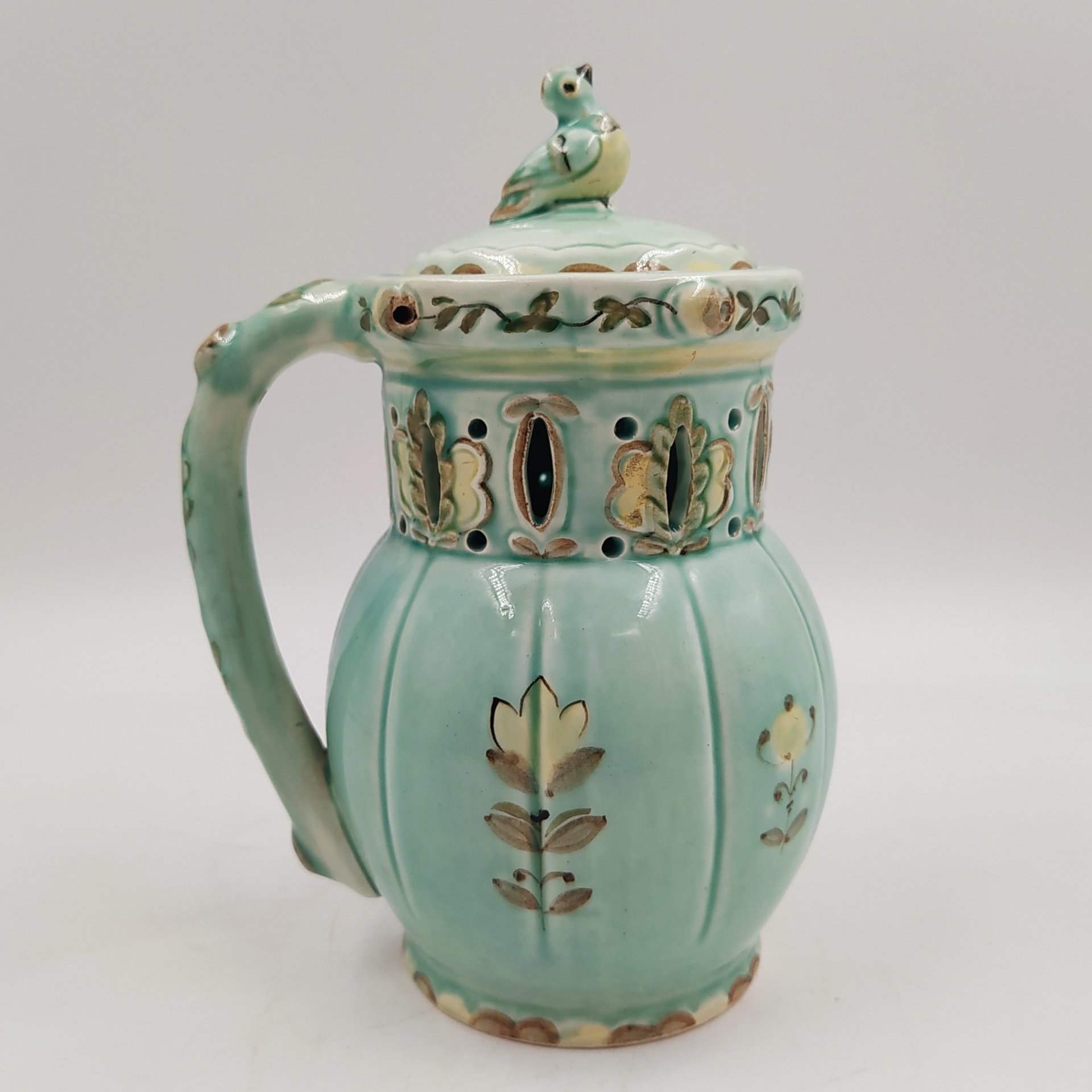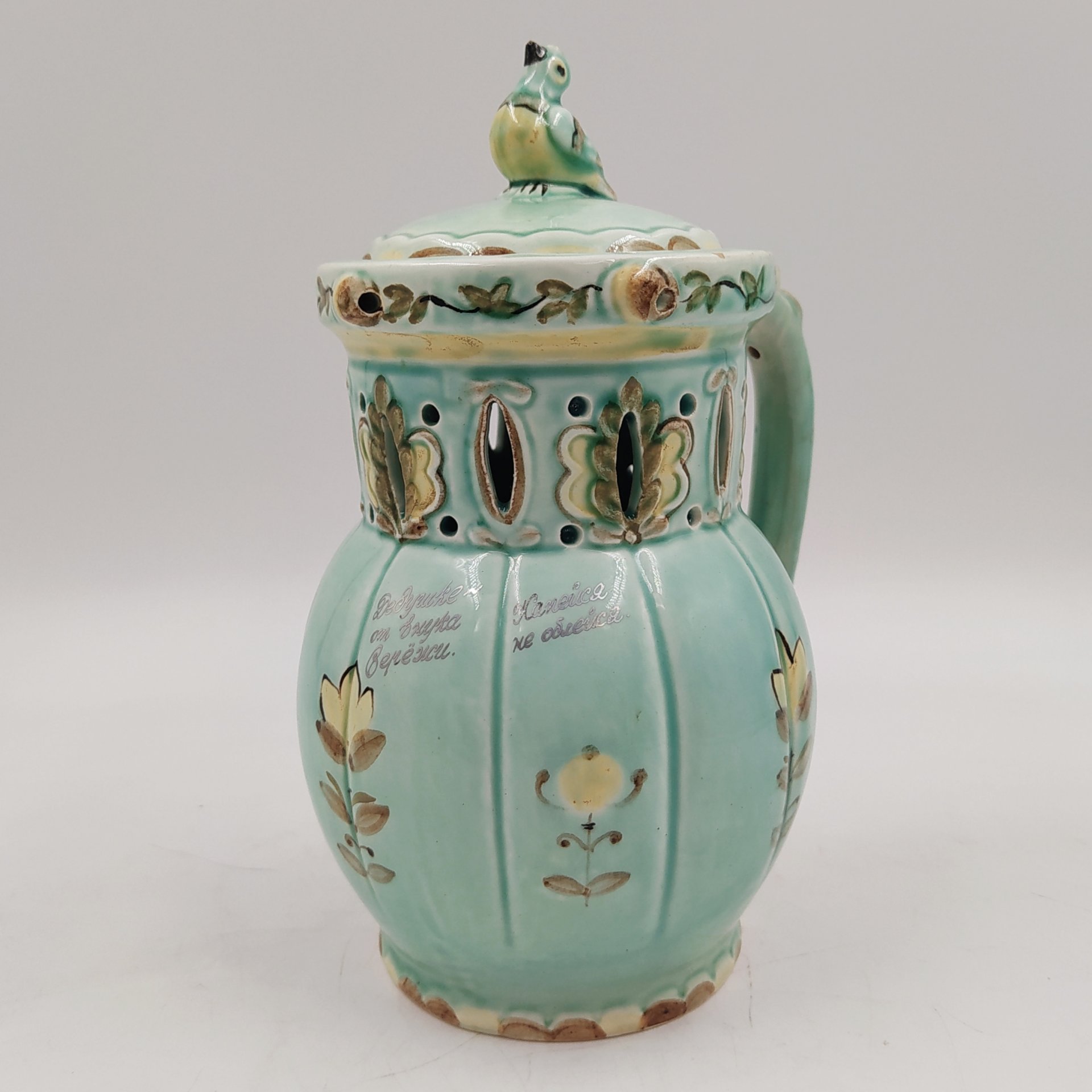 Кружка-шутиха с цветочным декором и фигурой птички на крышке (с дарственной надписью), фаянс, роспись, Конаковский фаянсовый завод им. М.И. Калинина (ЗиК Конаково), СССР, 1953 г. (арт. 57723)