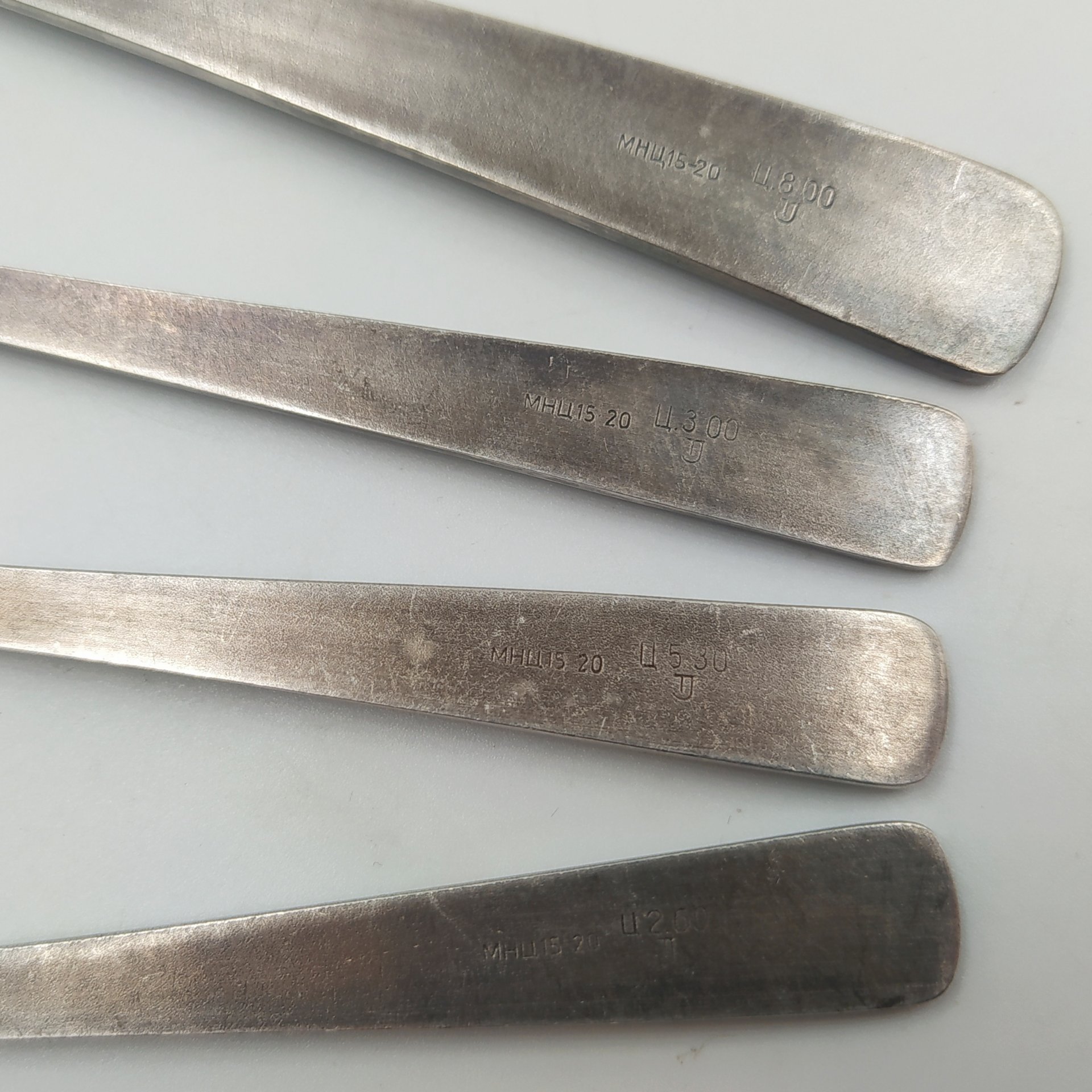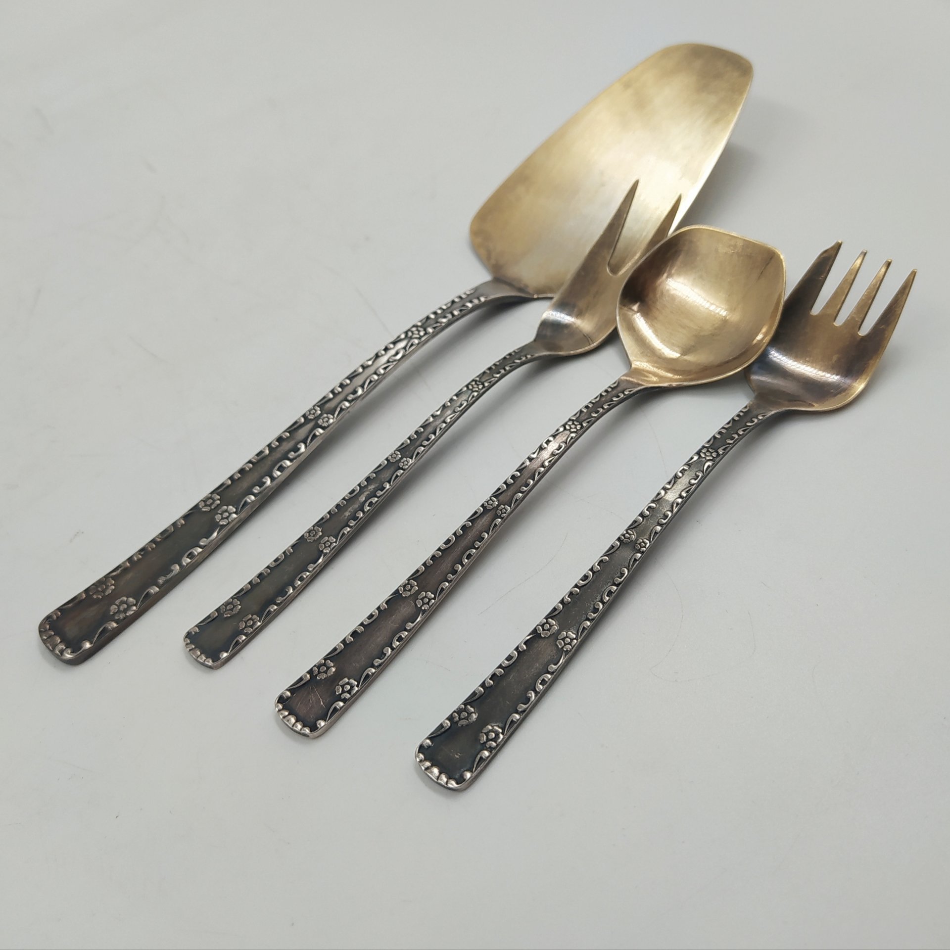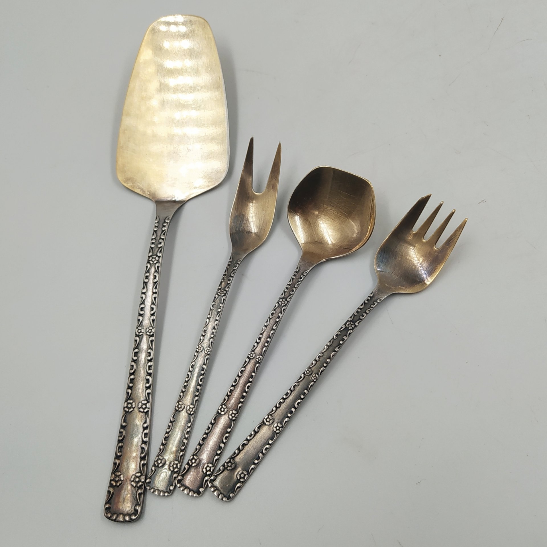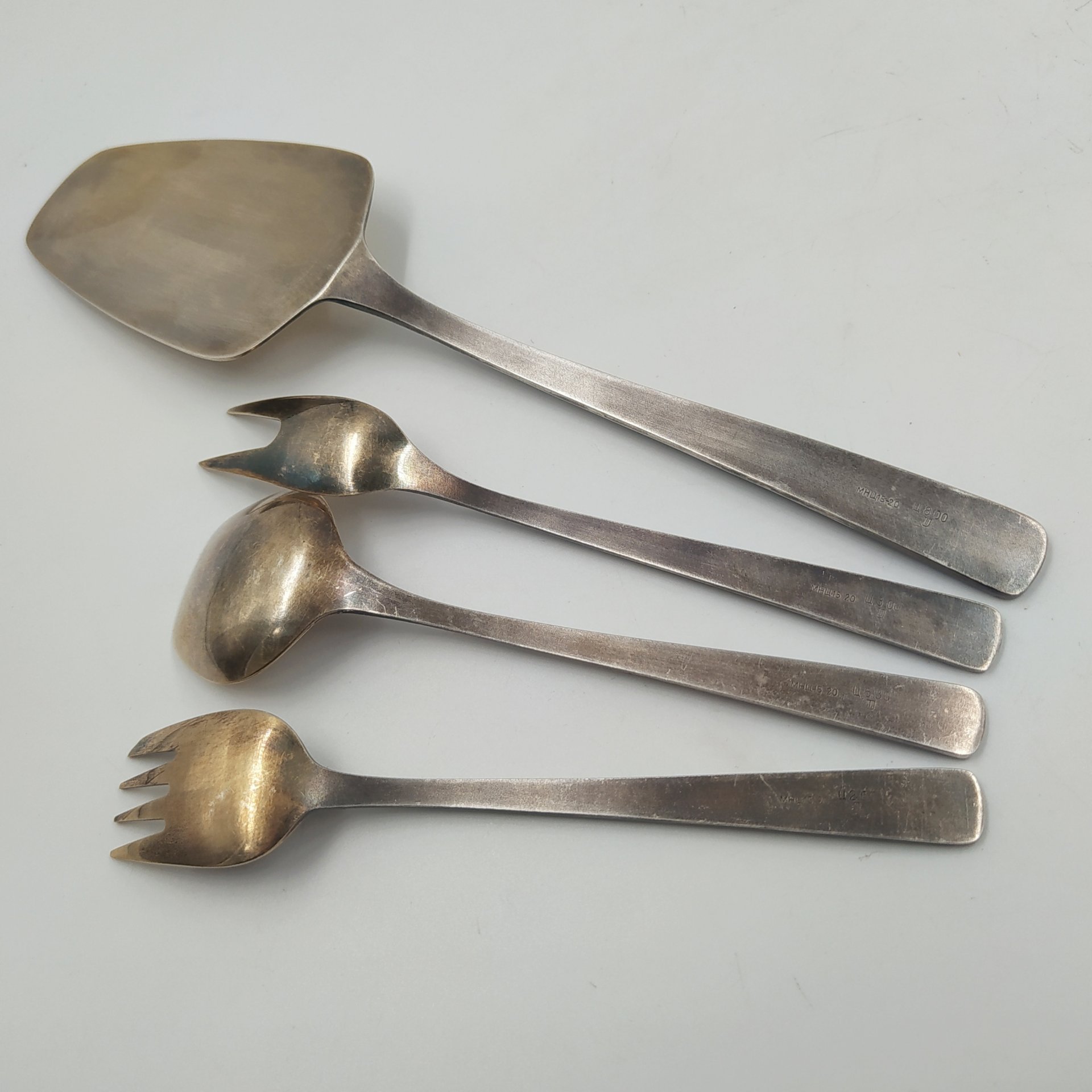 Набор сервировочный (лопатка для торта, совочек для сахара, вилка двузубая и вилка трехзубая), мНЦ (медь-никель-цинк), Таллинский ювелирный завод, СССР, 1960-1990 гг. (арт. 58278)