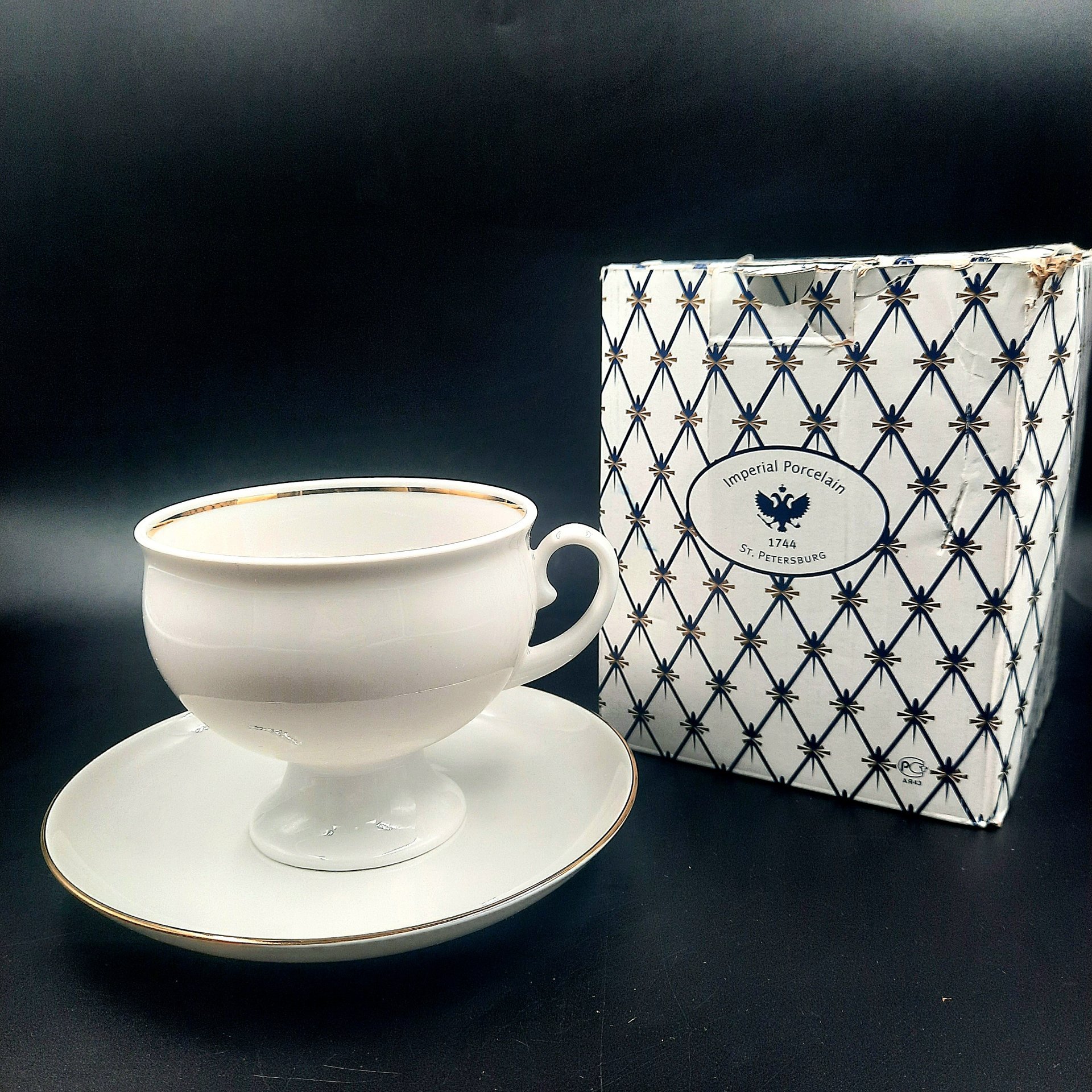 Пара чайная "Золотой кантик", форма "Классическая", в коробке, фарфор, золочение, картон, Императорский фарфоровый завод (ИФЗ), Российская Федерация, 2006-2024 гг., фарфор, золочение, картон, Российская Федерация, 2006-2024 гг. (арт. 57673)