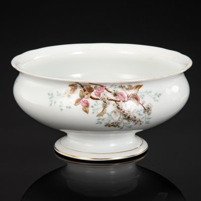 Террина круглая для сервировки горячих блюд на ножке, декорированная цветущей яблоней, фарфор, деколь с прорисовкой, золочение, Товарищество М.С. Кузнецова в Вербилках (г. Дмитров), Российская империя, 1891-1917 гг. (арт. 44334)